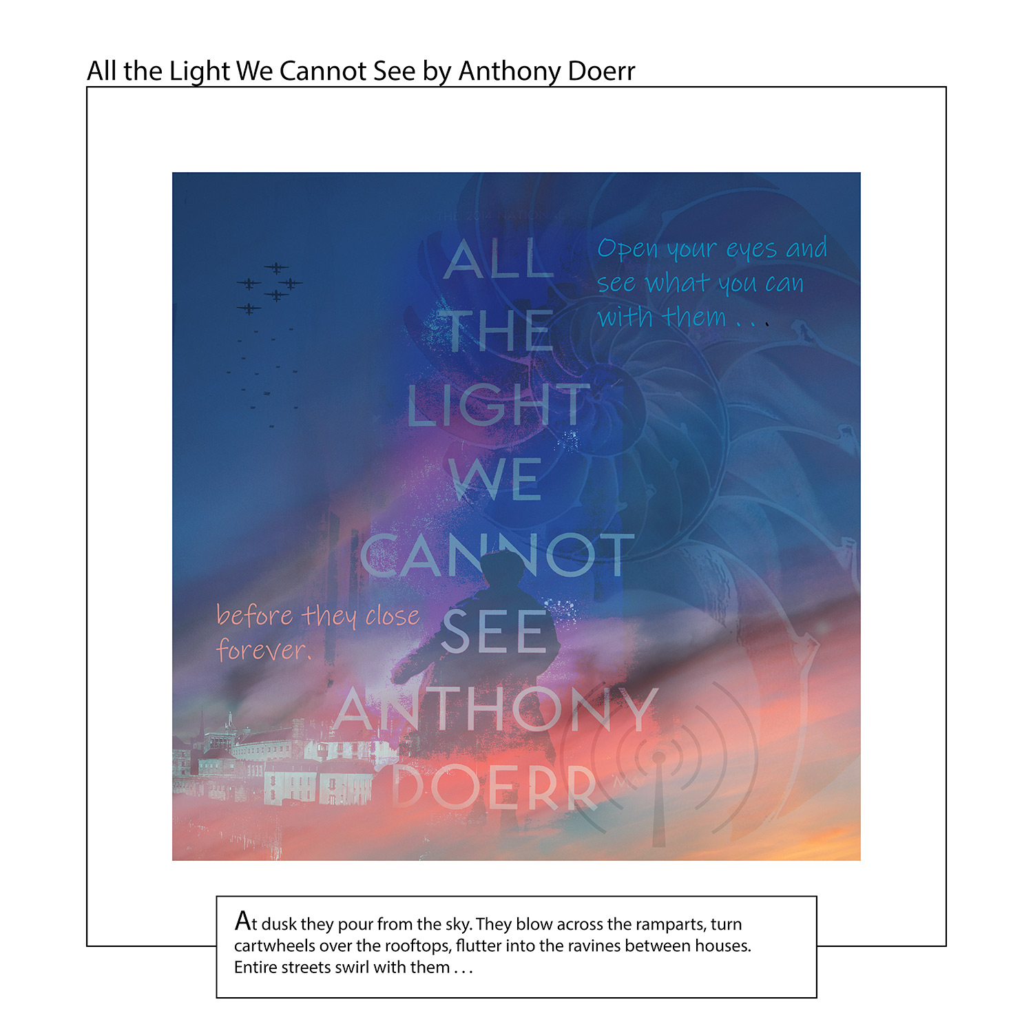 The project was to make art based around one of our favorite books, while trying to incorporate, if possible, an image of the book itself and elements that might relate to the content of the book. I had just finished reading an exceptional novel, “All the Light We Cannot See”, the 2015 Pulitzer Prize Winner for fiction written by Anthony Doerr. I highly recommend it. So, here’s my effort. I included my favorite quote from the book inside the image and the bottom quote is the first line or two from the novel. The various other elements in the image relate to the contents of the book. Hope you like it.